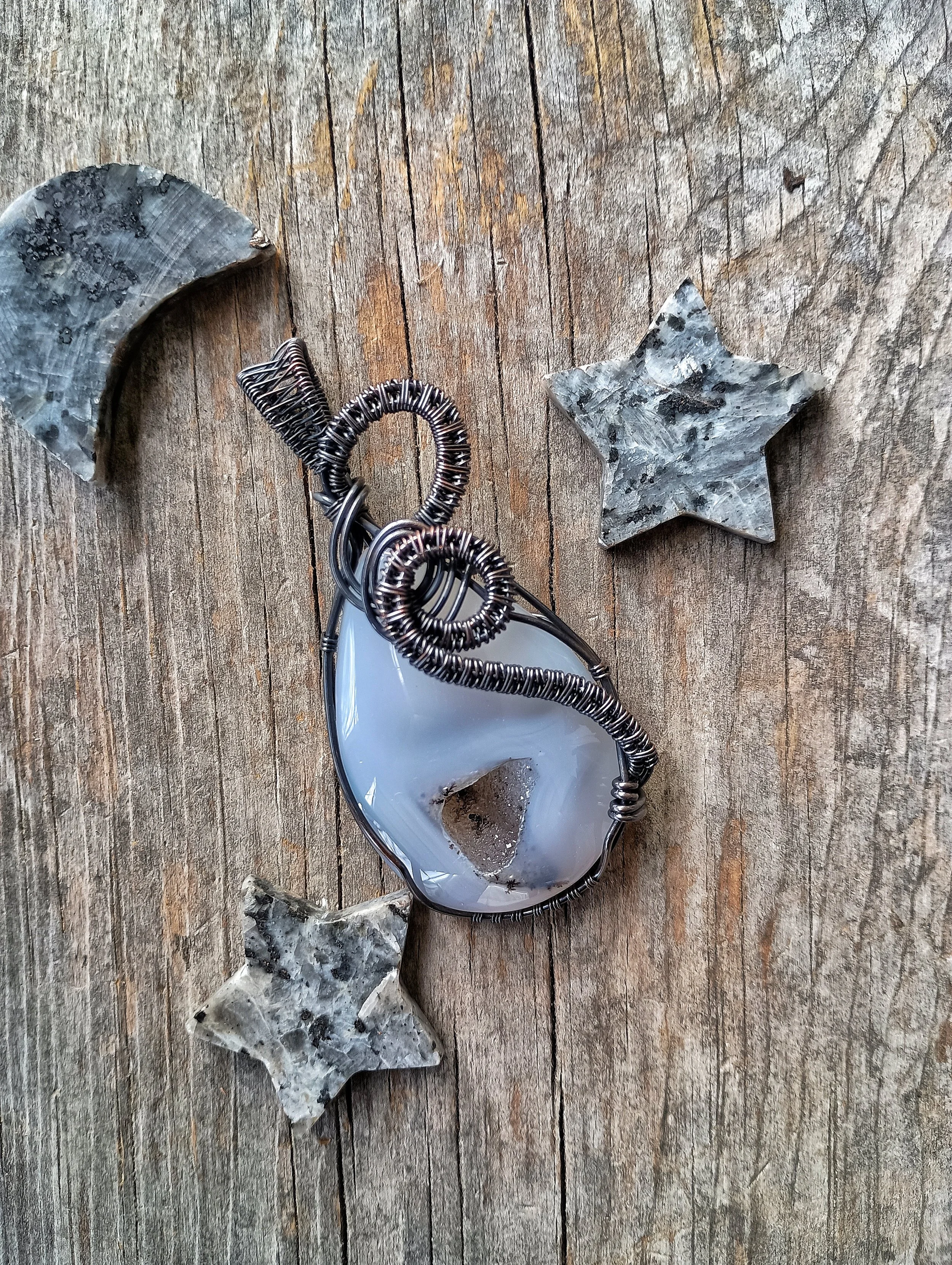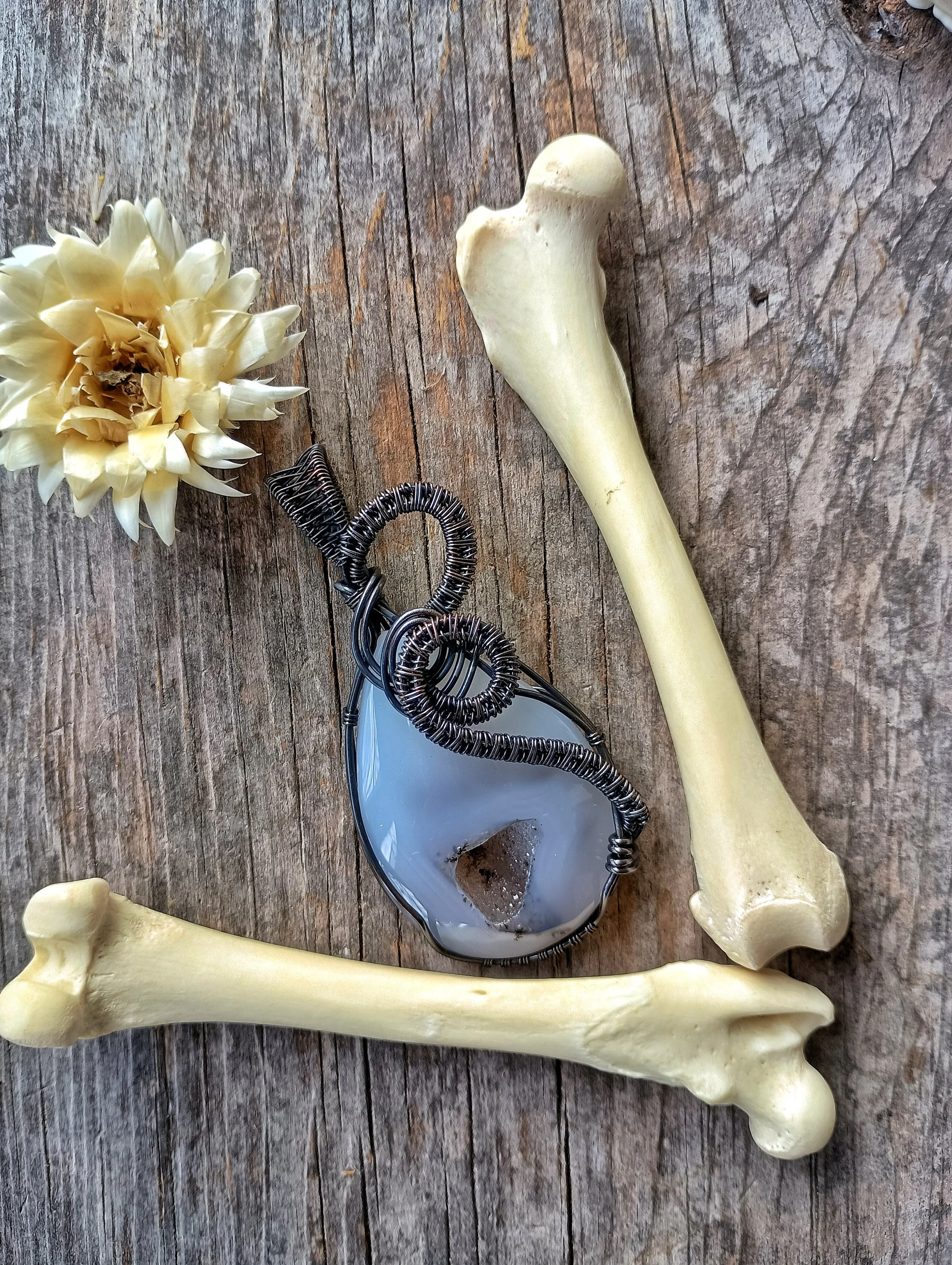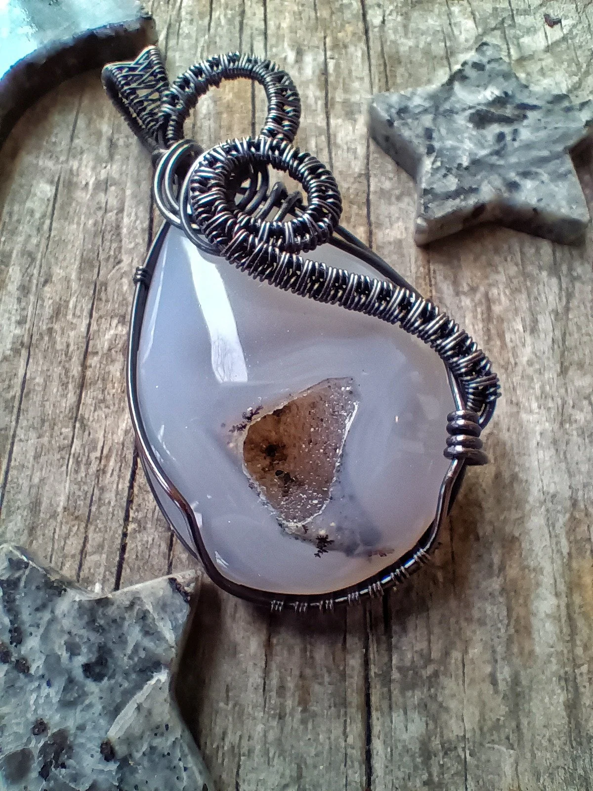 Druzy Agate gemstone wrapped in handwoven copper wire. Copper has been patinaed for dark color and entire piece has been coated with a metal sealant. Comes on an adjustable leather cord.