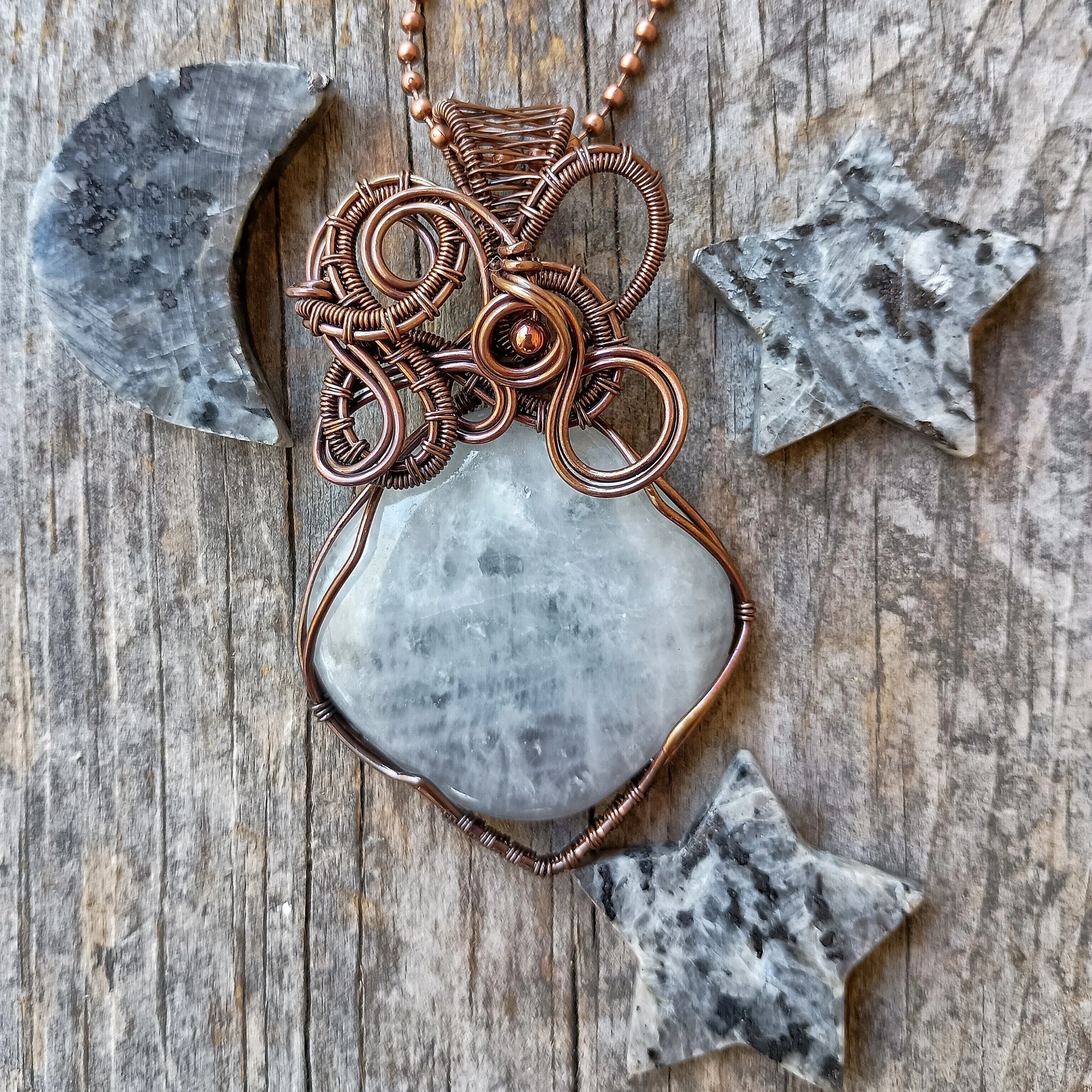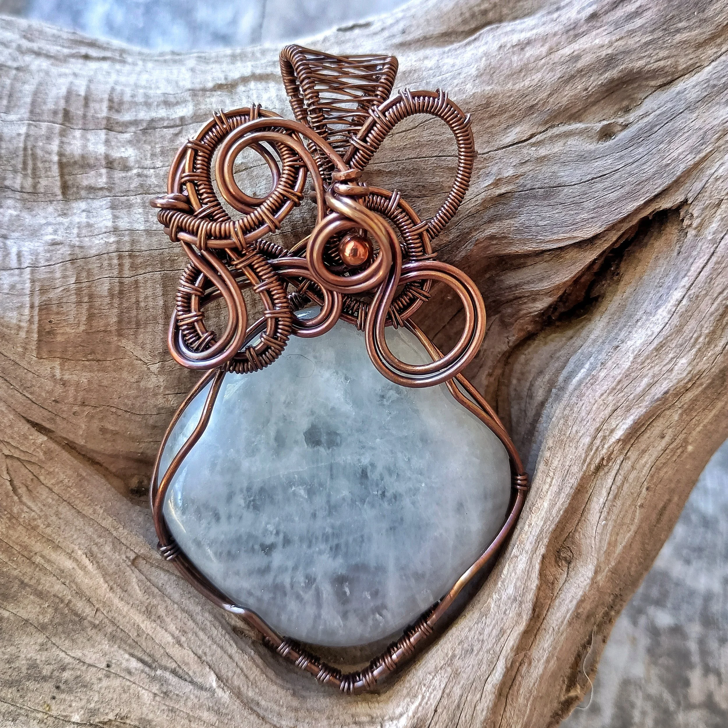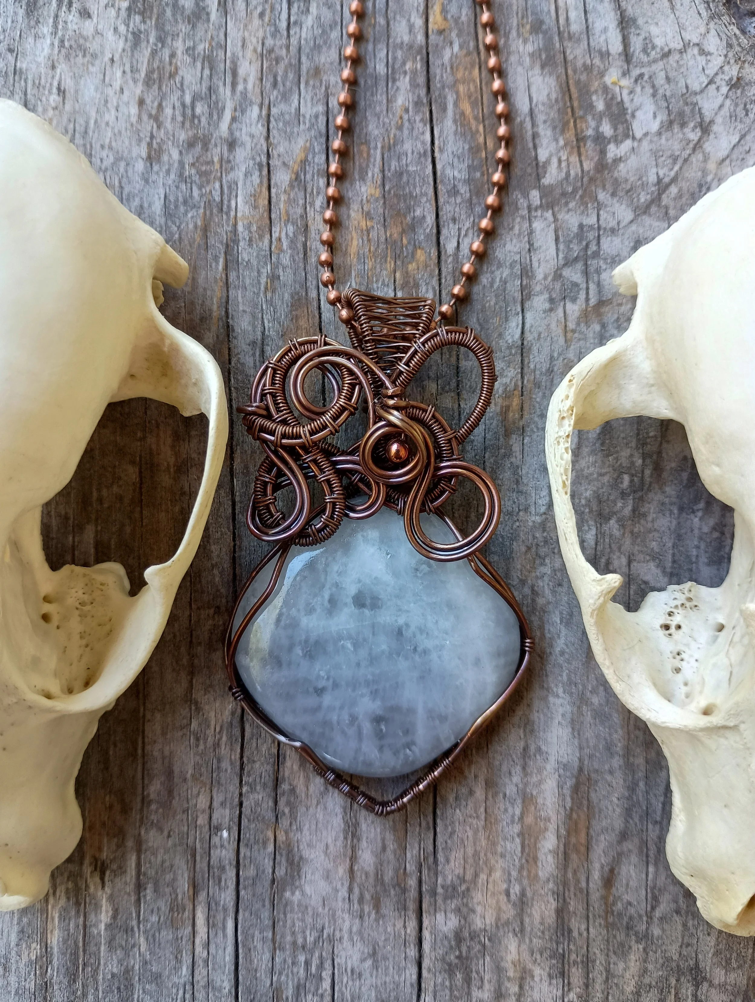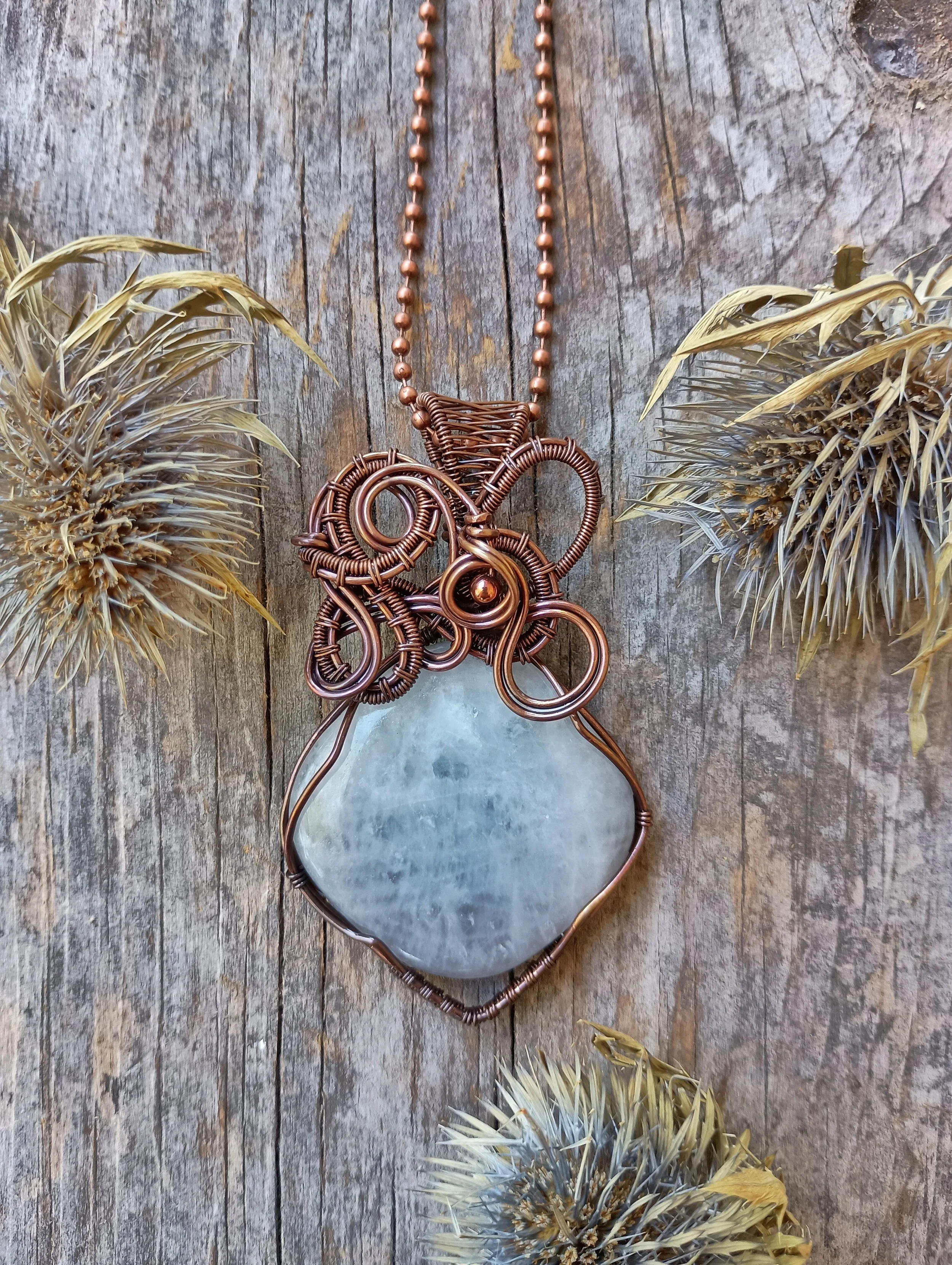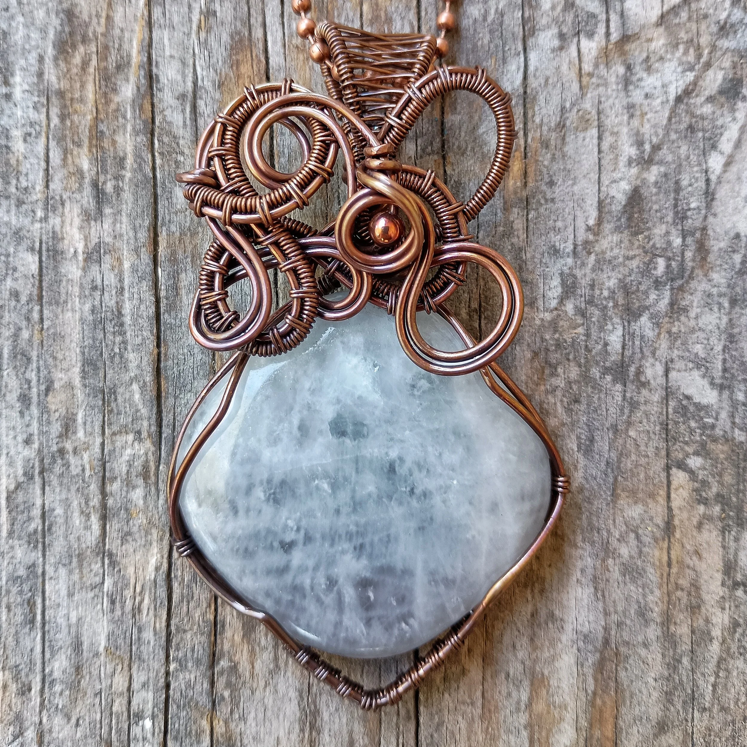 I purchased this Luna Quartz stone in a cute little crystal shop in Salem Massachusetts on our honeymoon. It is wrapped in handwoven copper wire with a copper accent bead. Copper wire has been patinaed for antique color and entire piece has been coated with a metal sealant. Comes on an adjustable leather cord. Each one of my pieces is a one of a kind creation.