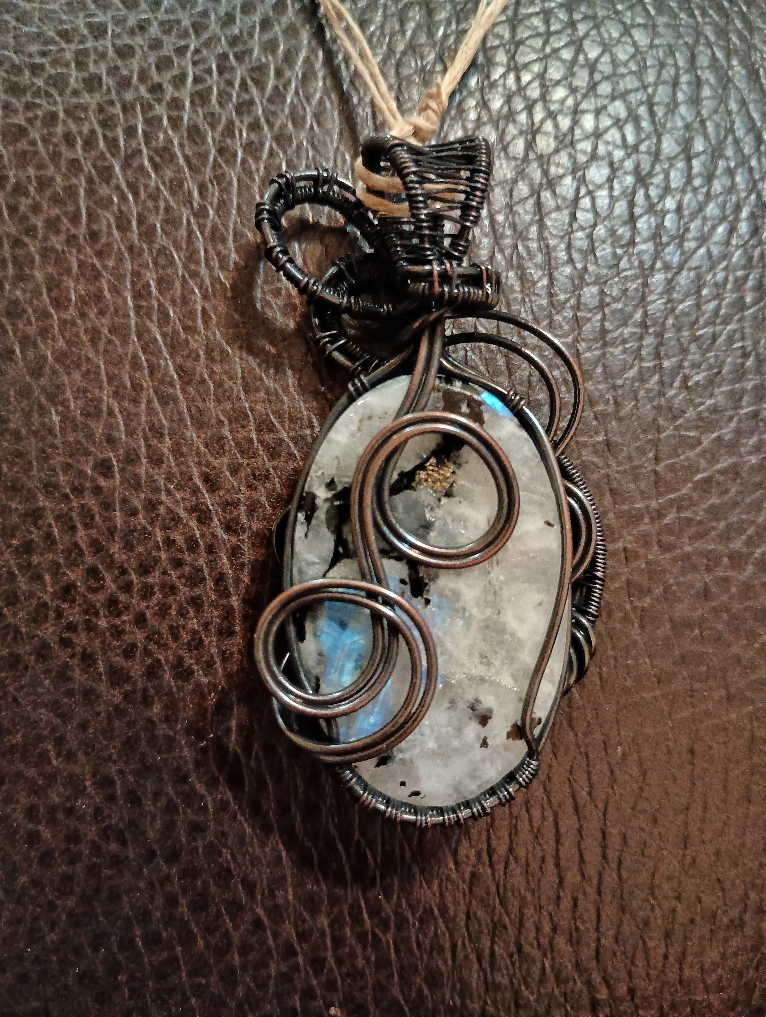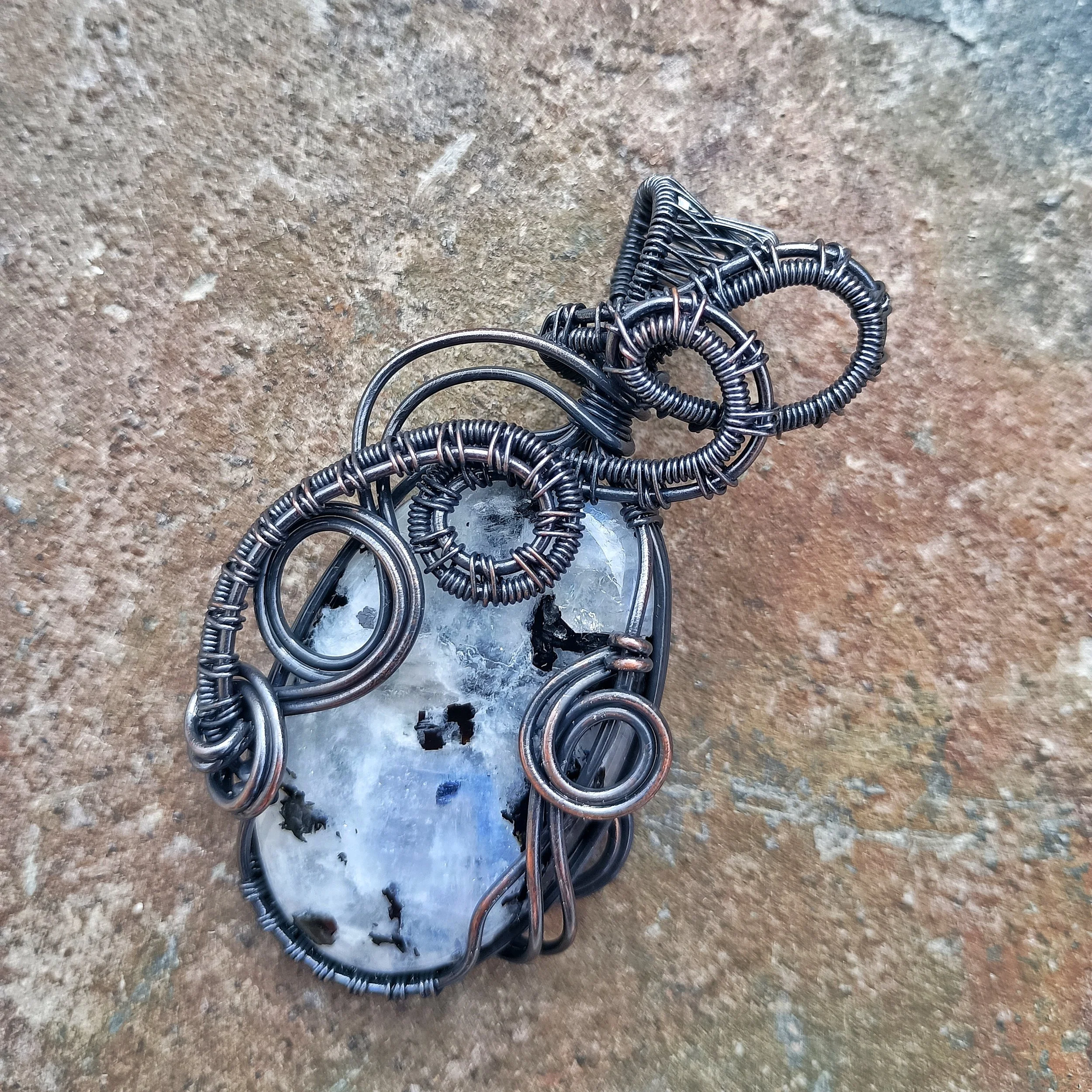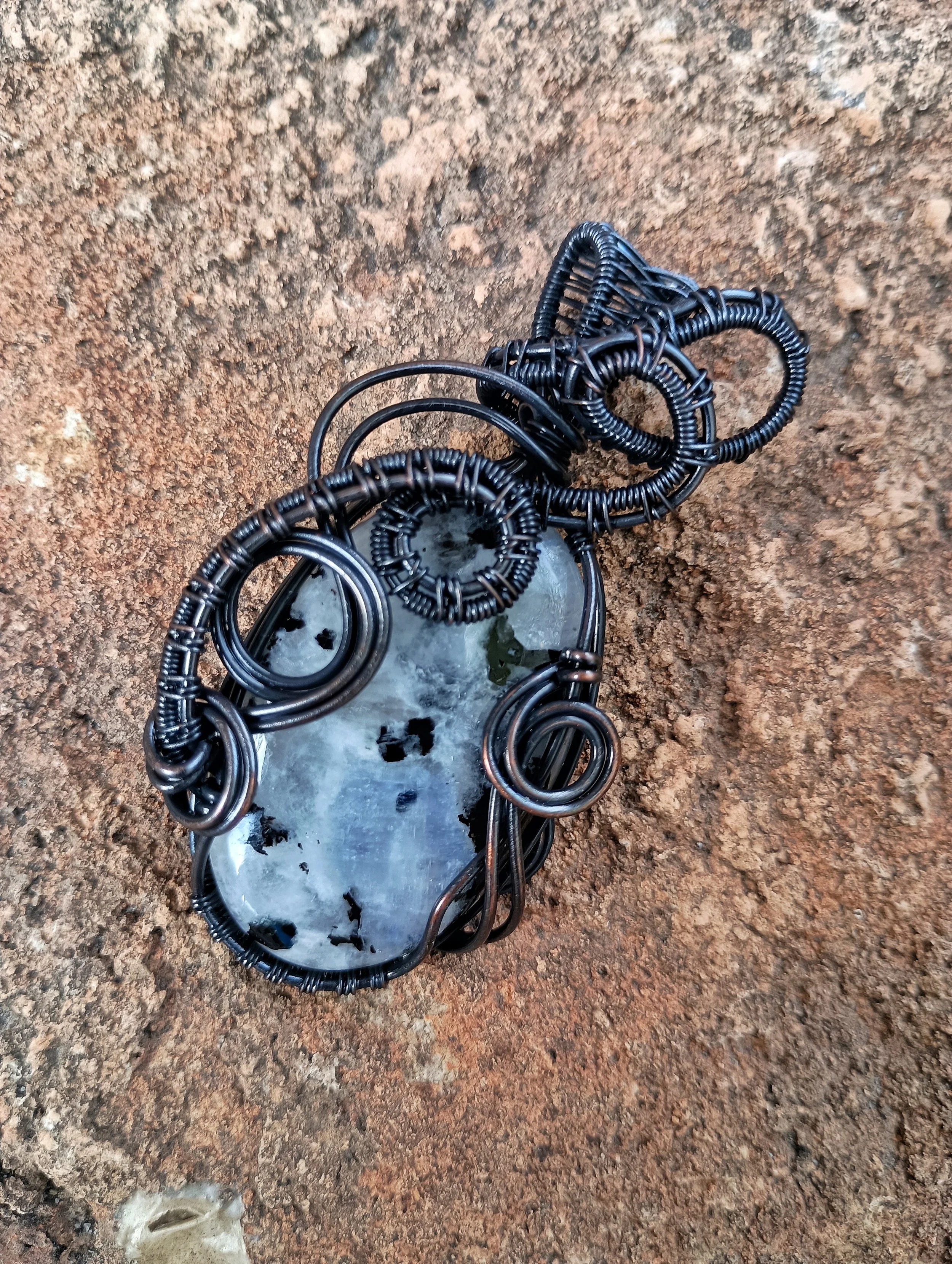Rainbow Moonstone with Black Tourmaline wrapped in handwoven copper wire. Copper has been patinaed for dark color and entire piece has been coated with a metal sealant. Each of my pieces are one of a kind creations. Comes on an adjustable leather cord.