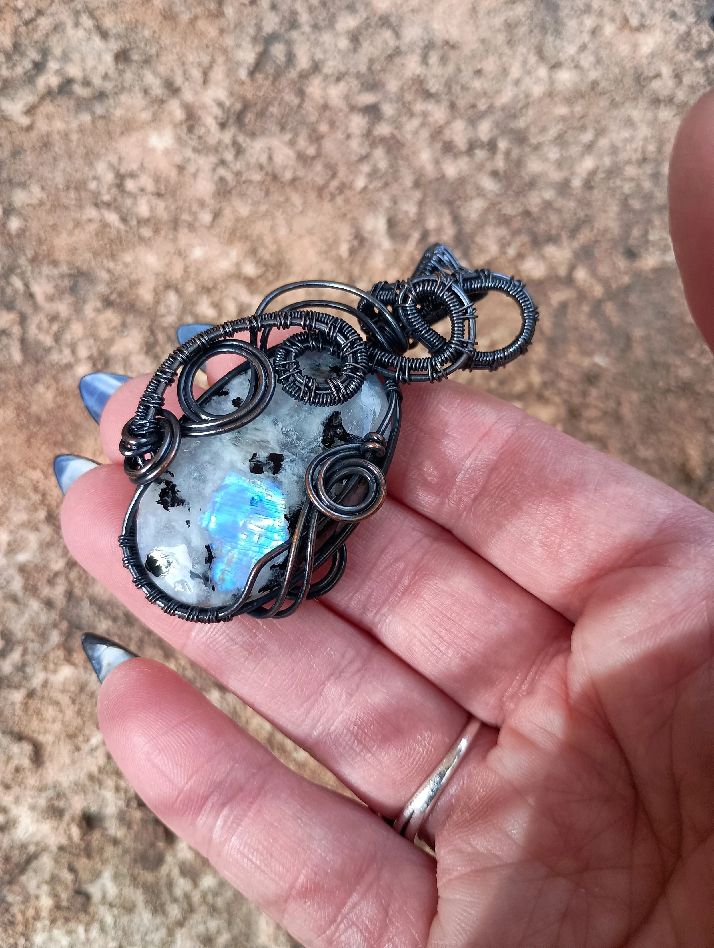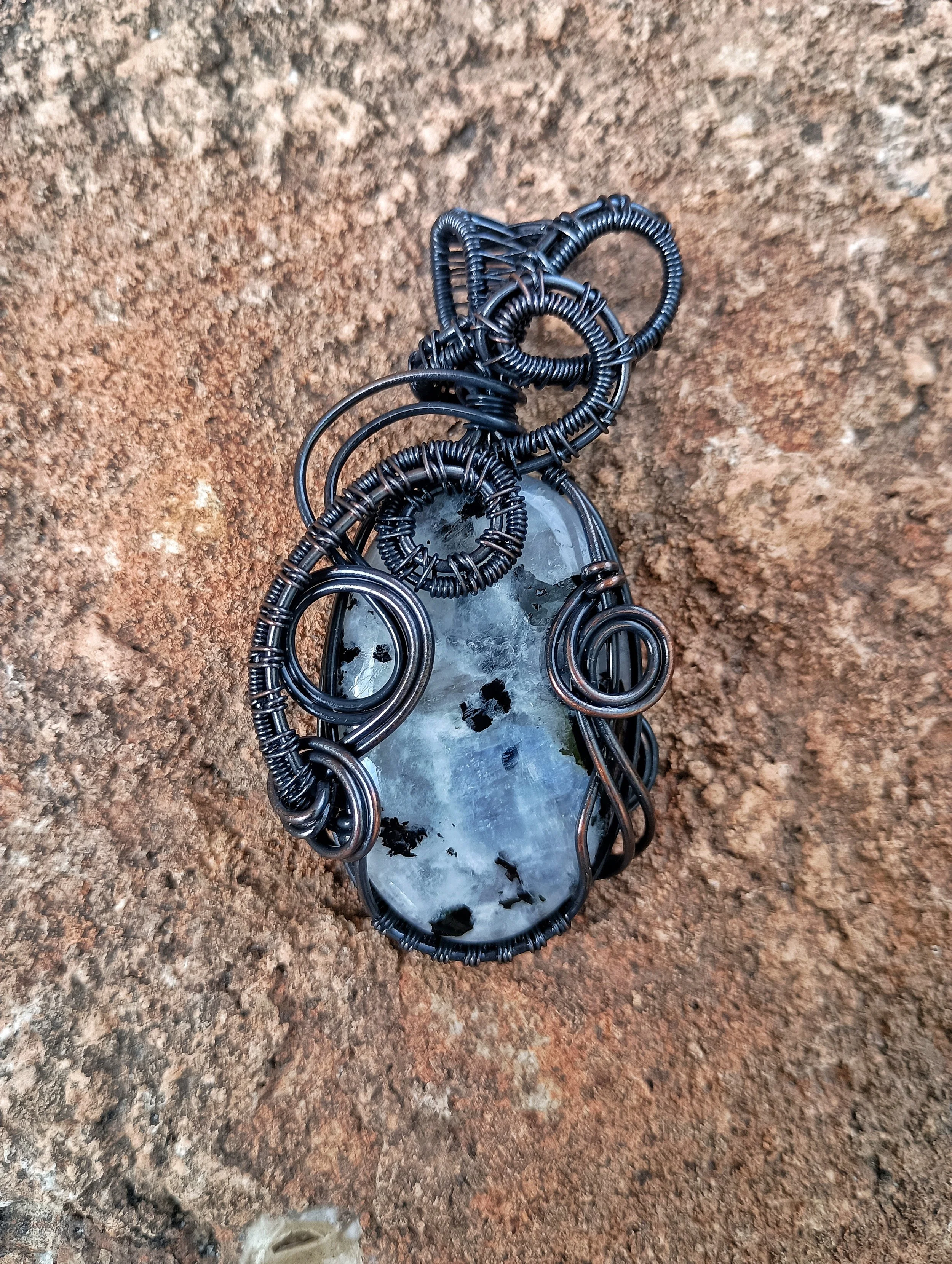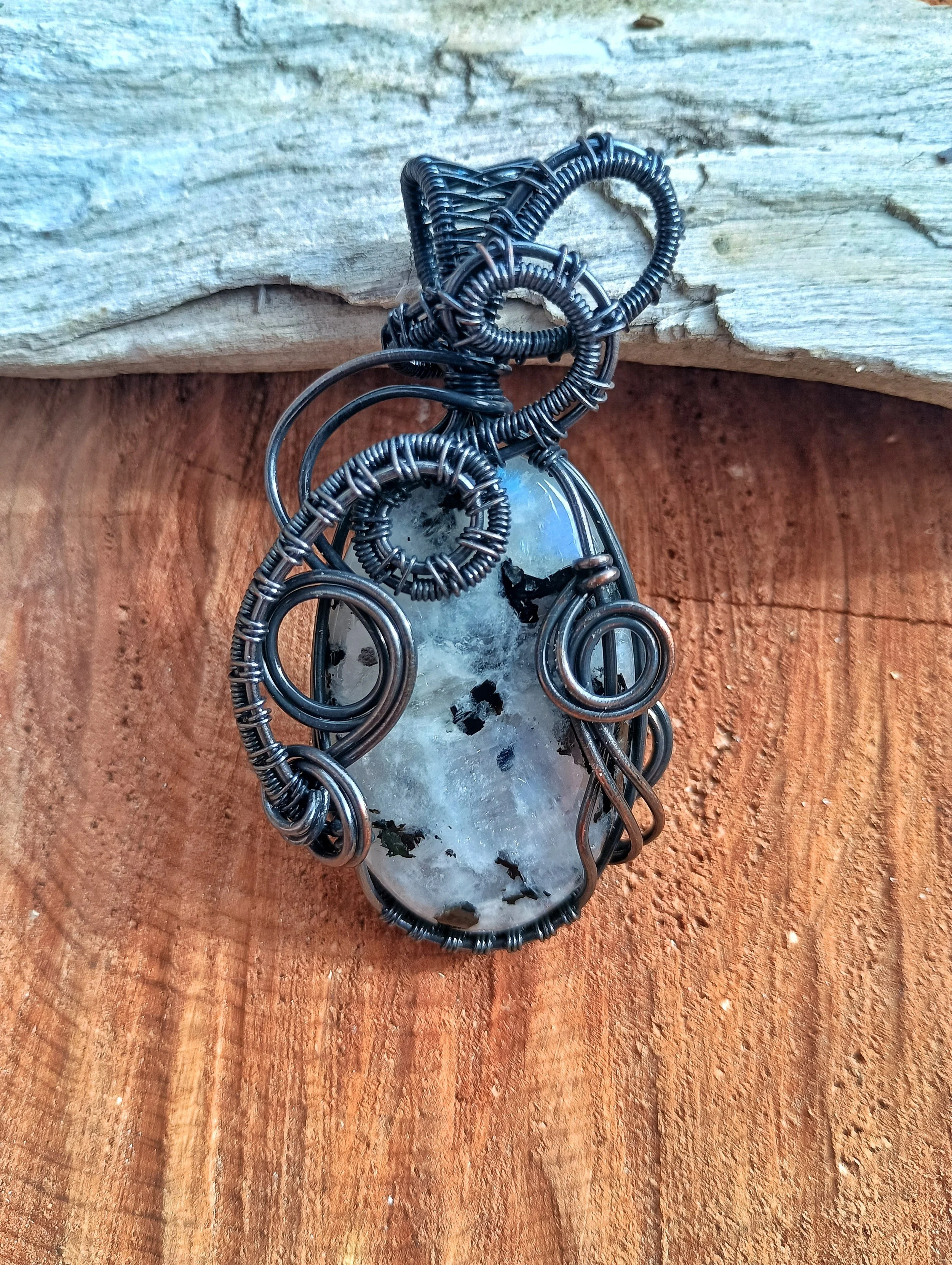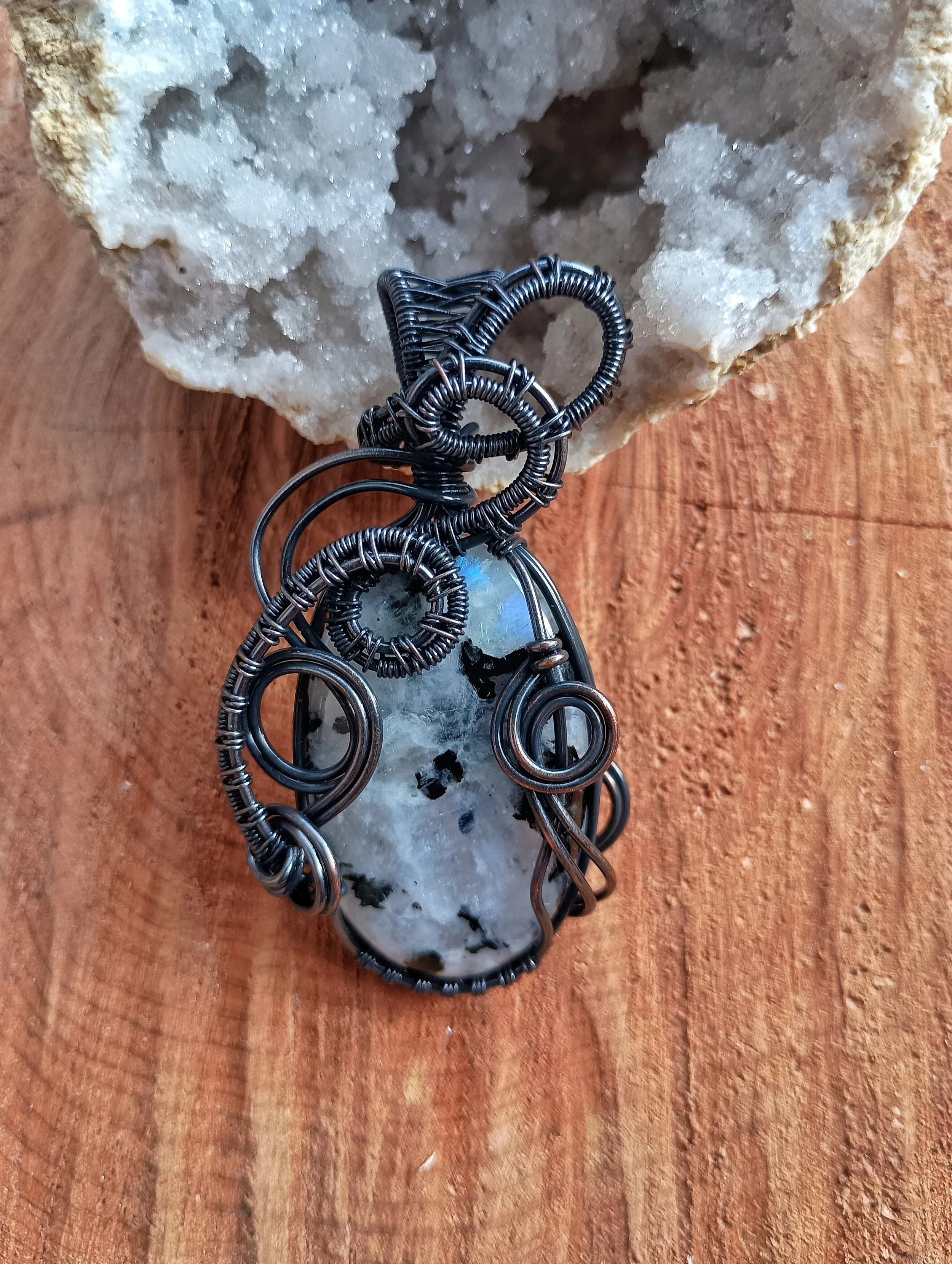 Rainbow Moonstone with Black Tourmaline wrapped in handwoven copper wire. Copper has been patinaed for dark color and entire piece has been coated with a metal sealant. Each of my pieces are one of a kind creations. Comes on an adjustable leather cord.