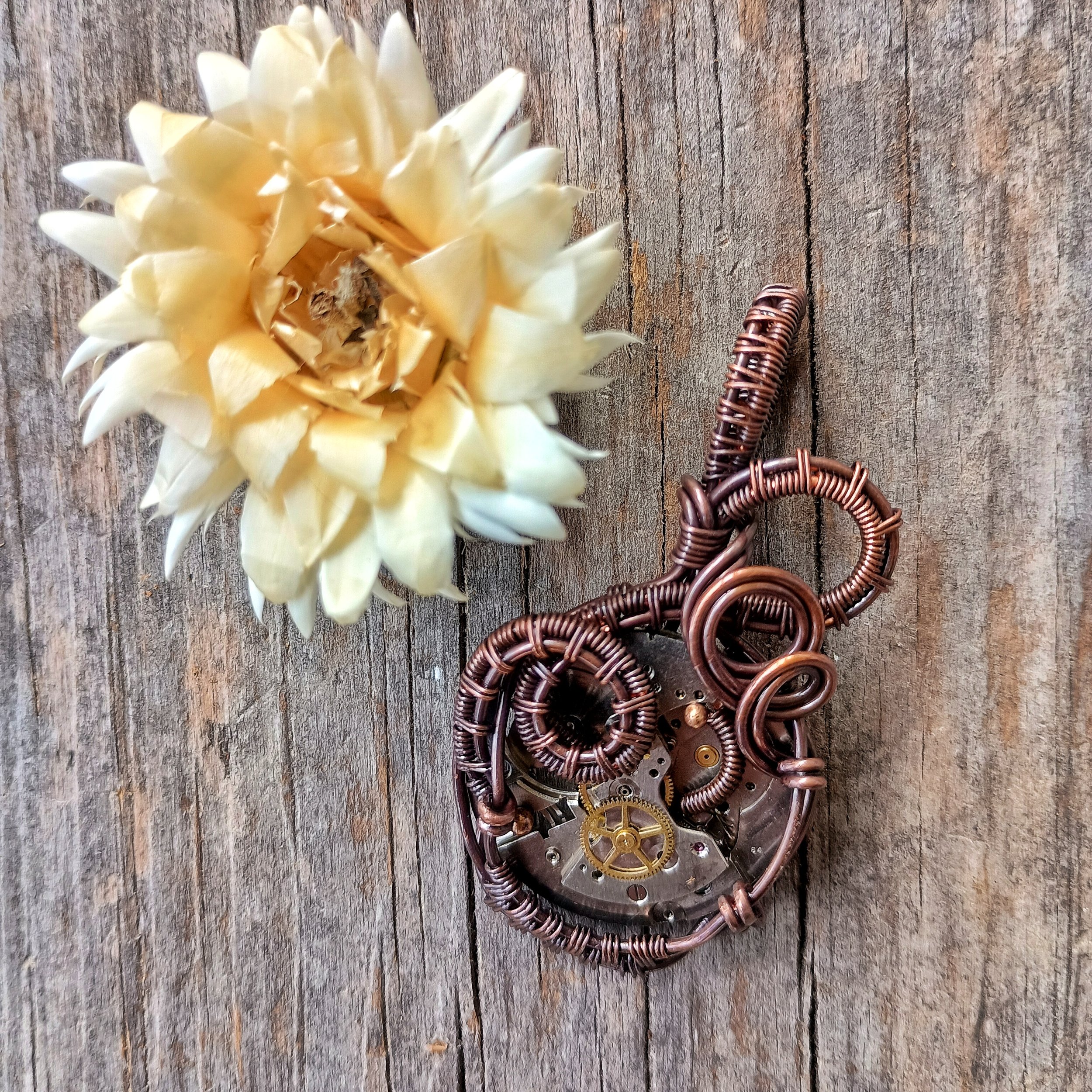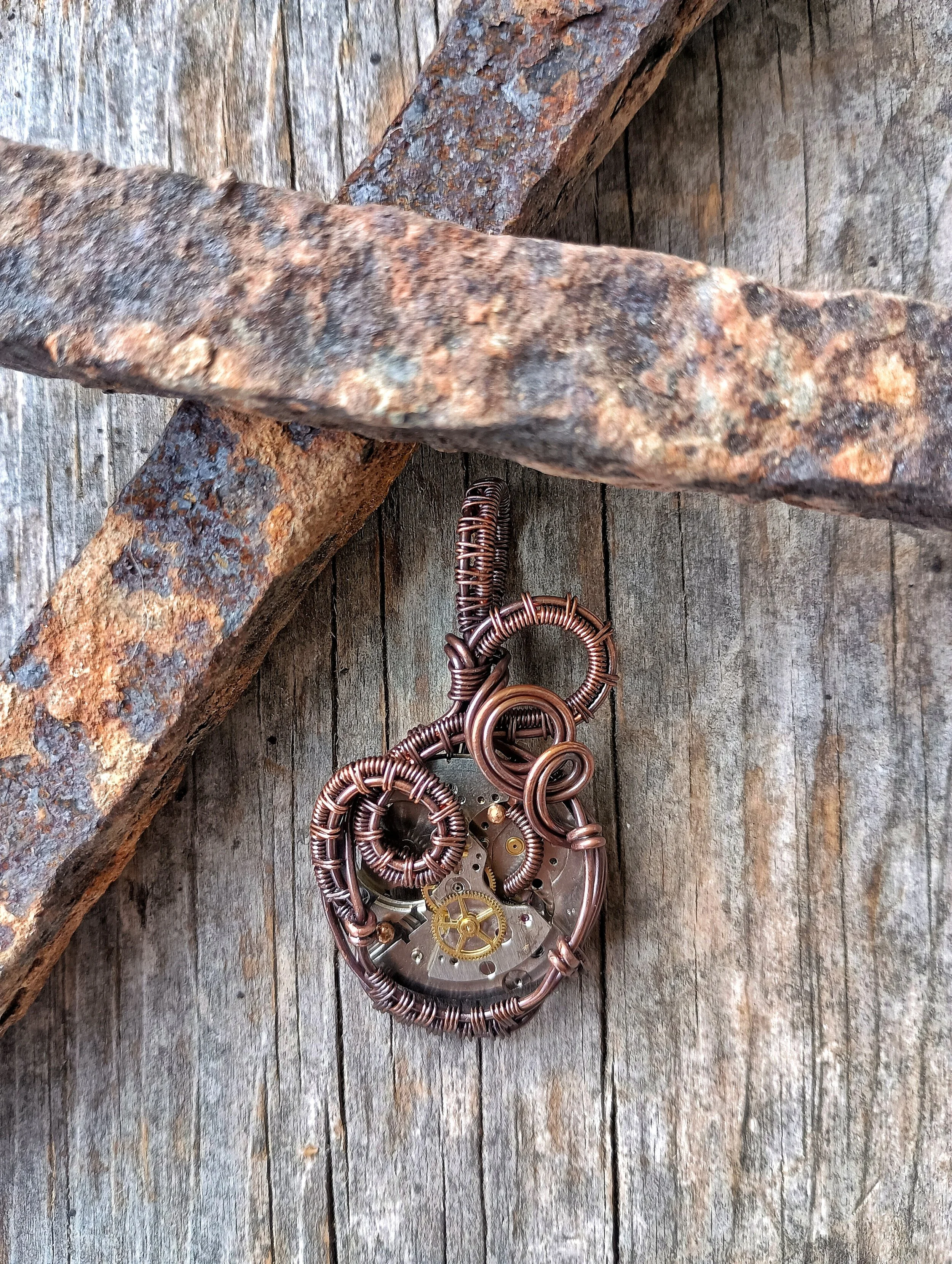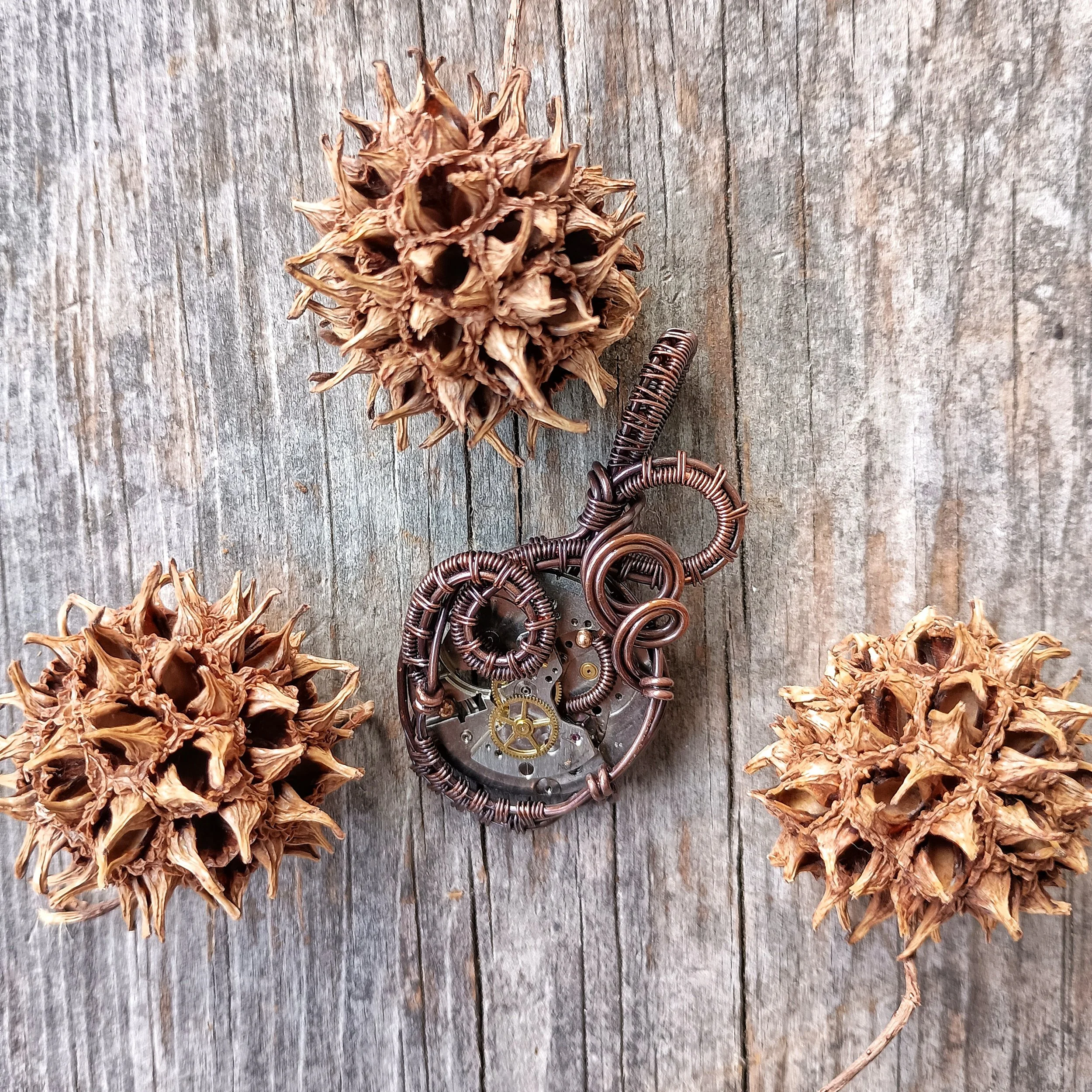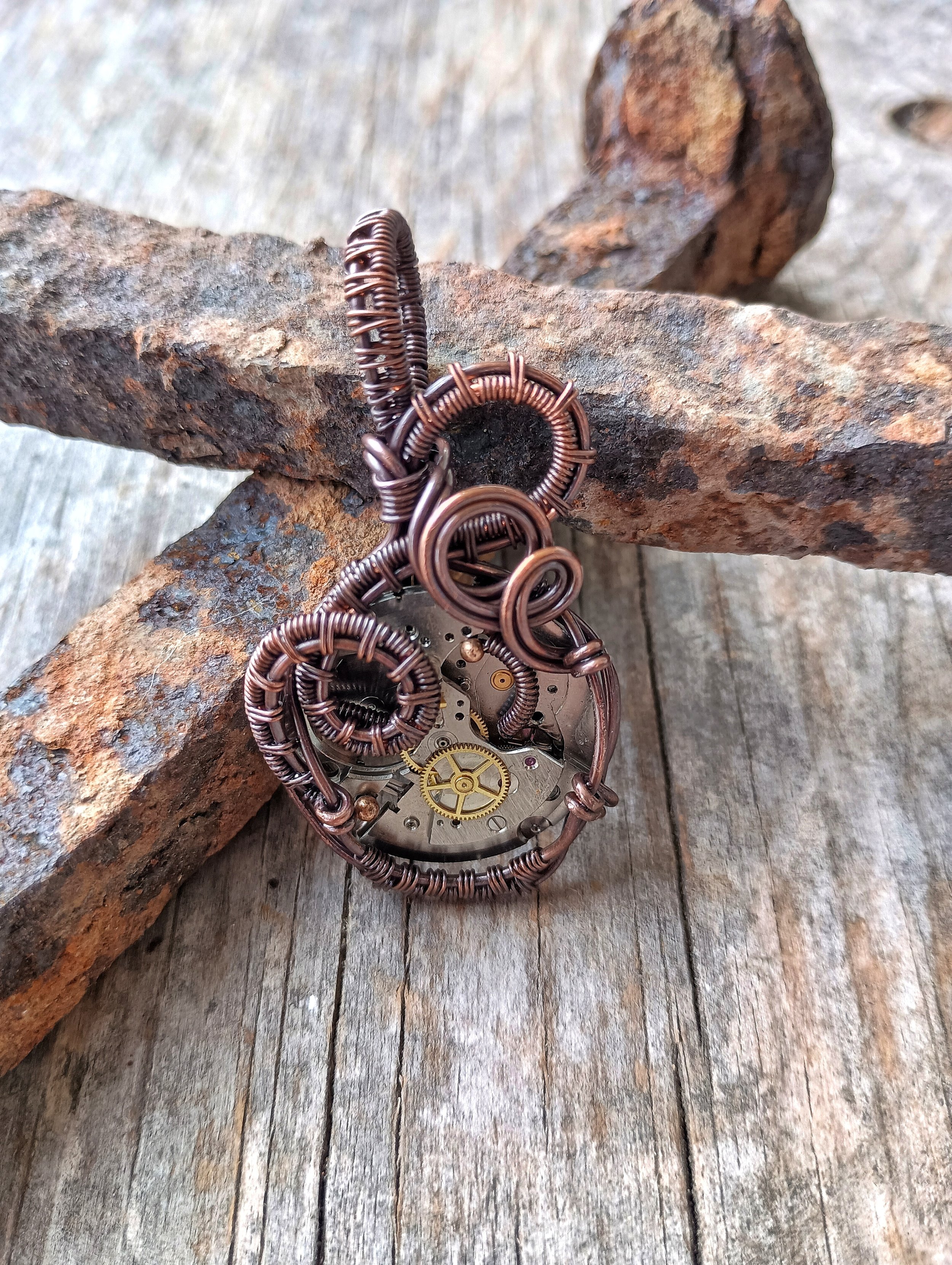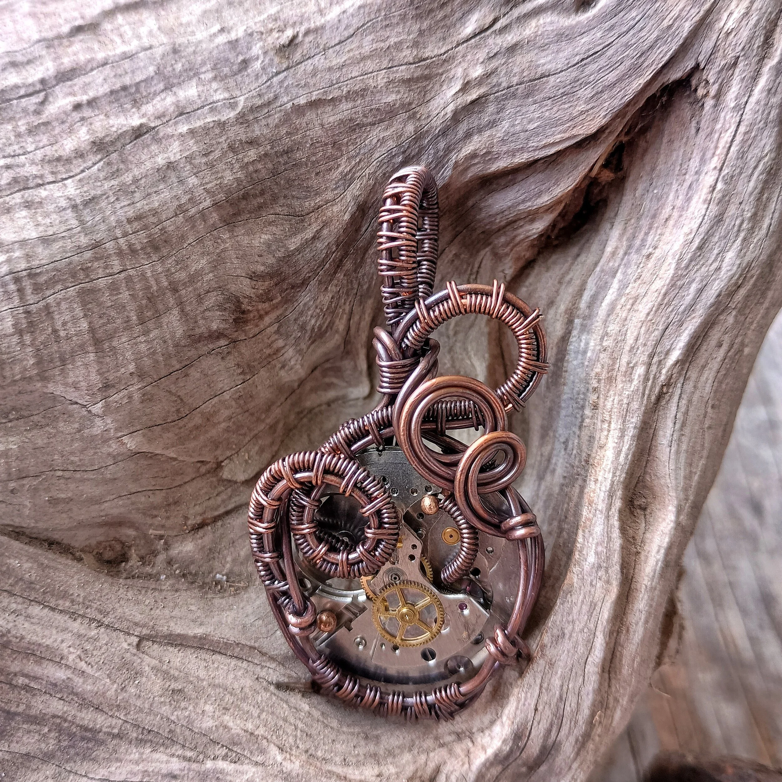 Watch Movement wrapped in handwoven copper wire. Copper has been patinaed for antique color and entire piece has been coated with a metal sealant. Comes on an adjustable leather cord.