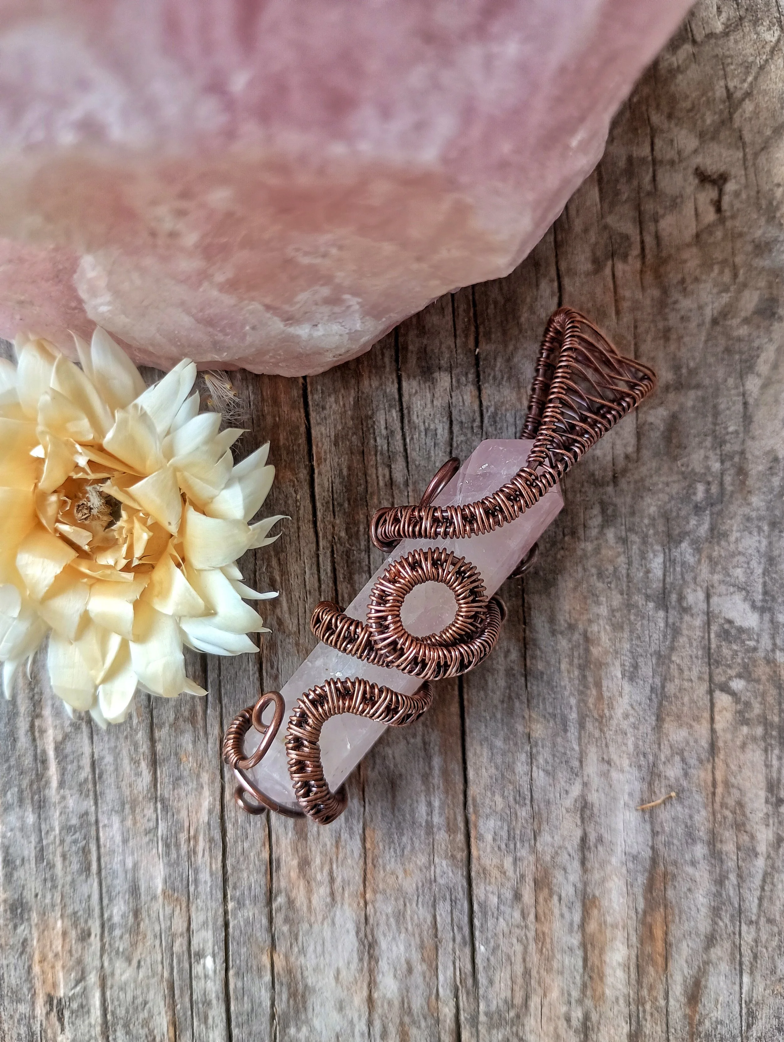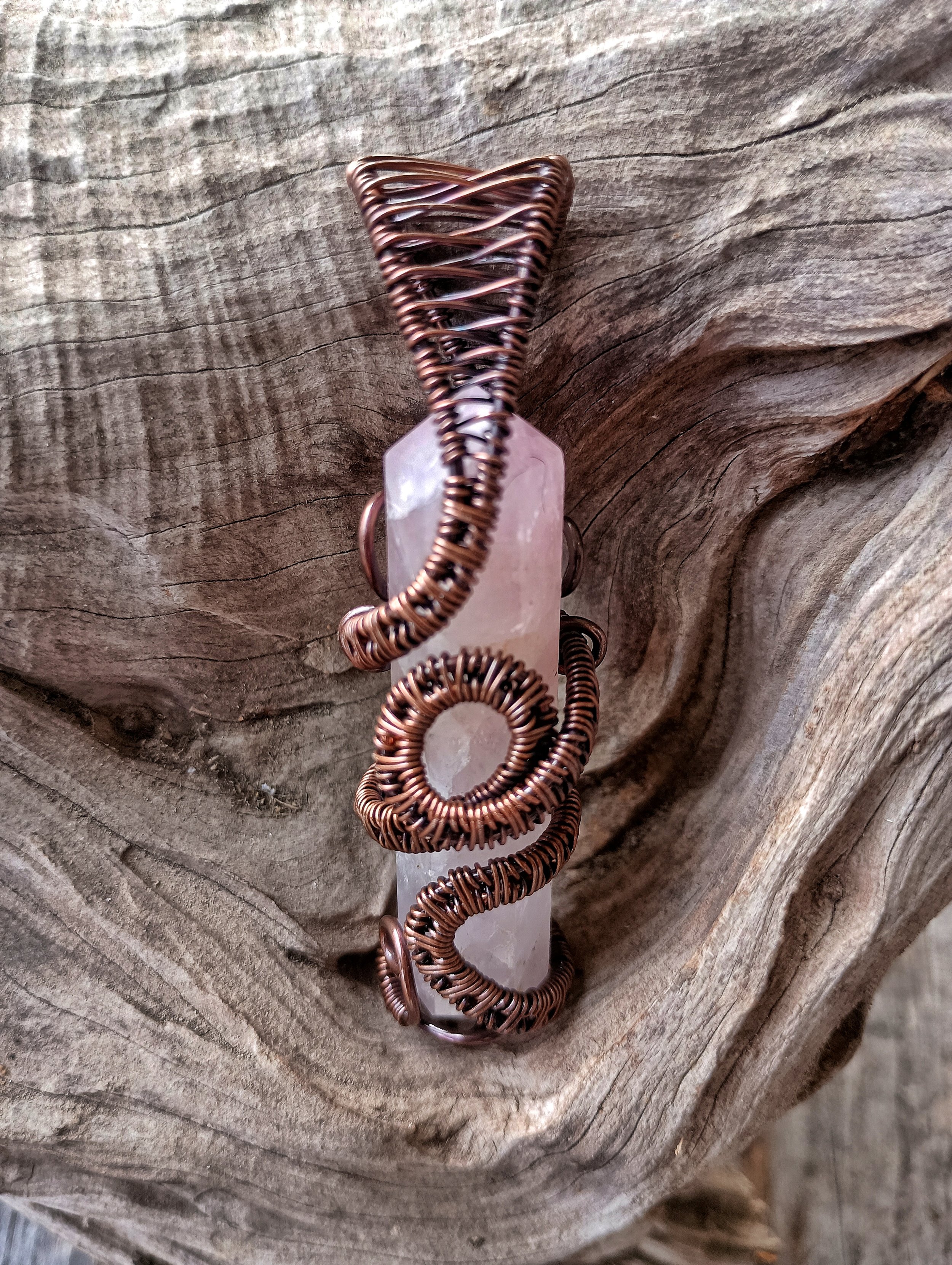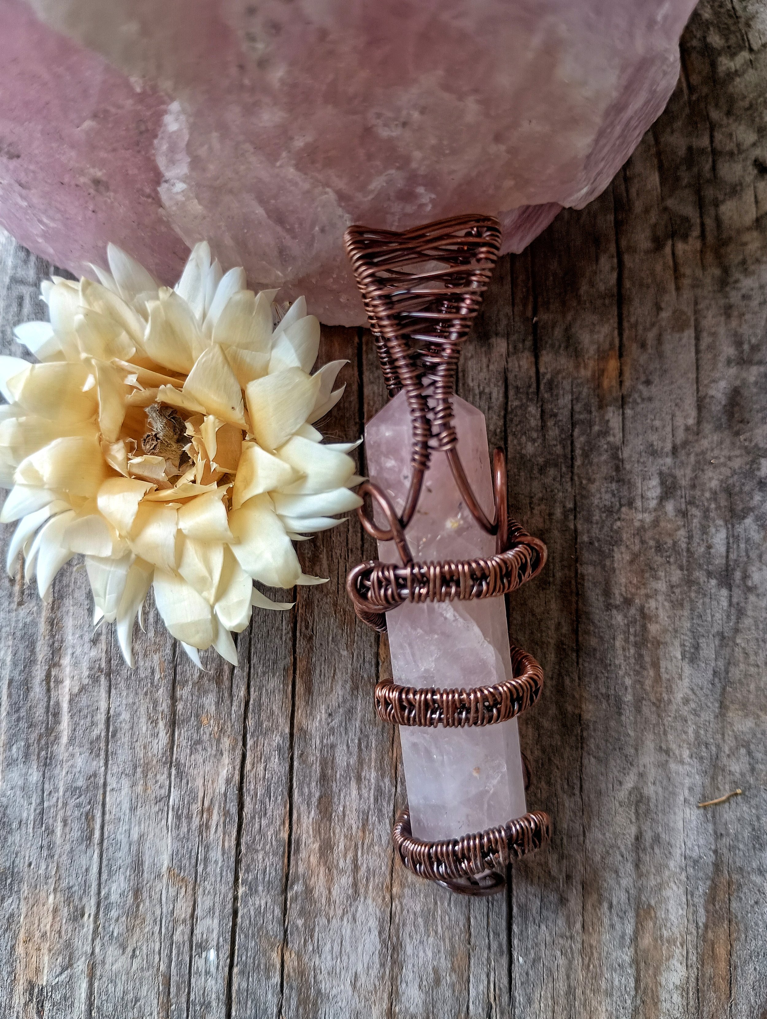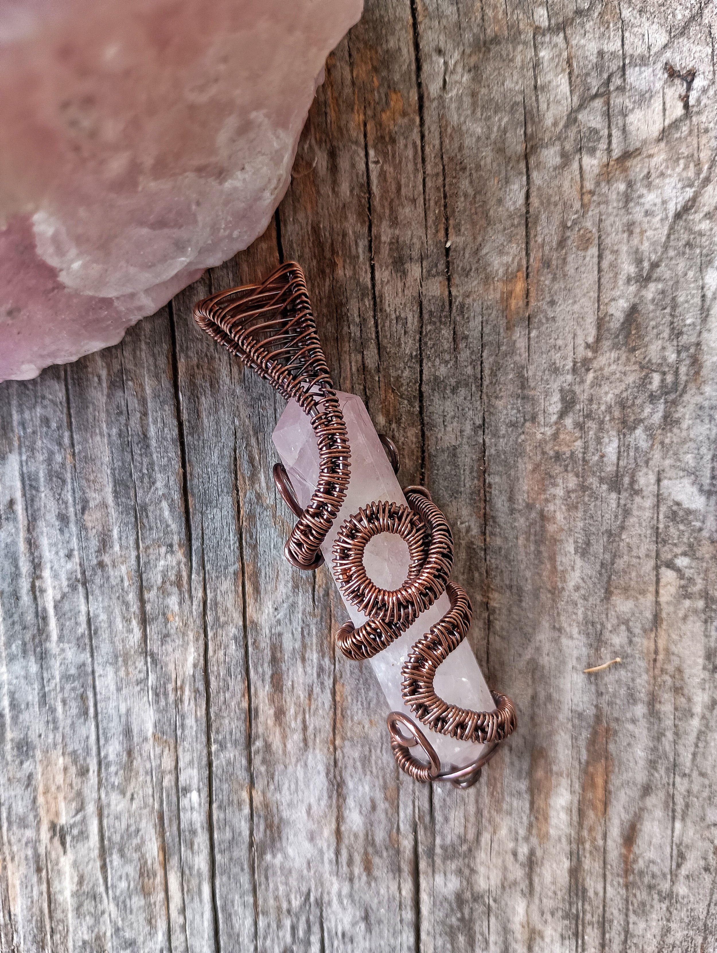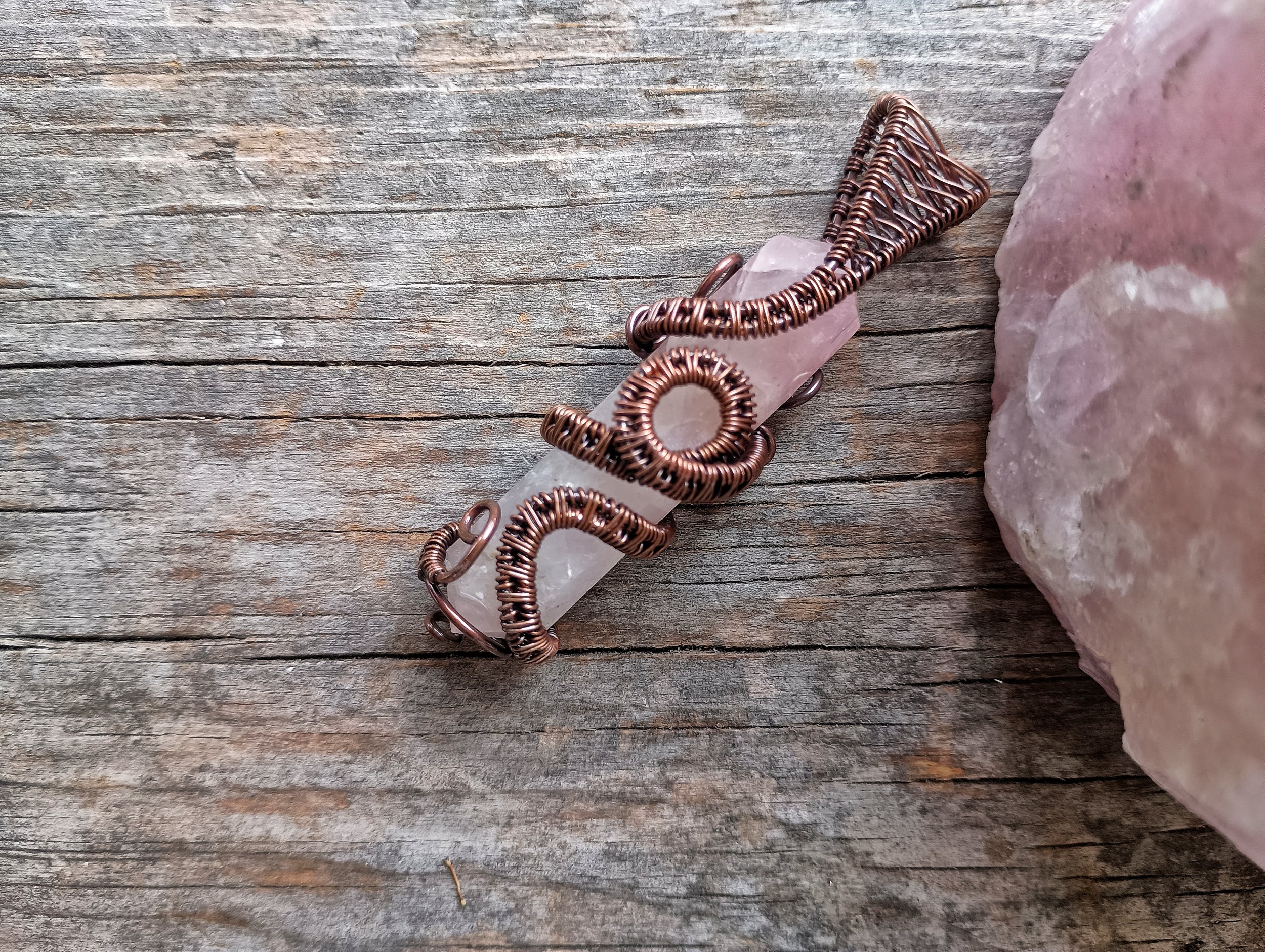 Rose Quartz Crystal wrapped in handwoven copper wire. Copper has been patinaed for antique color and entire piece has been coated with a metal sealant. Comes on an adjustable leather cord.