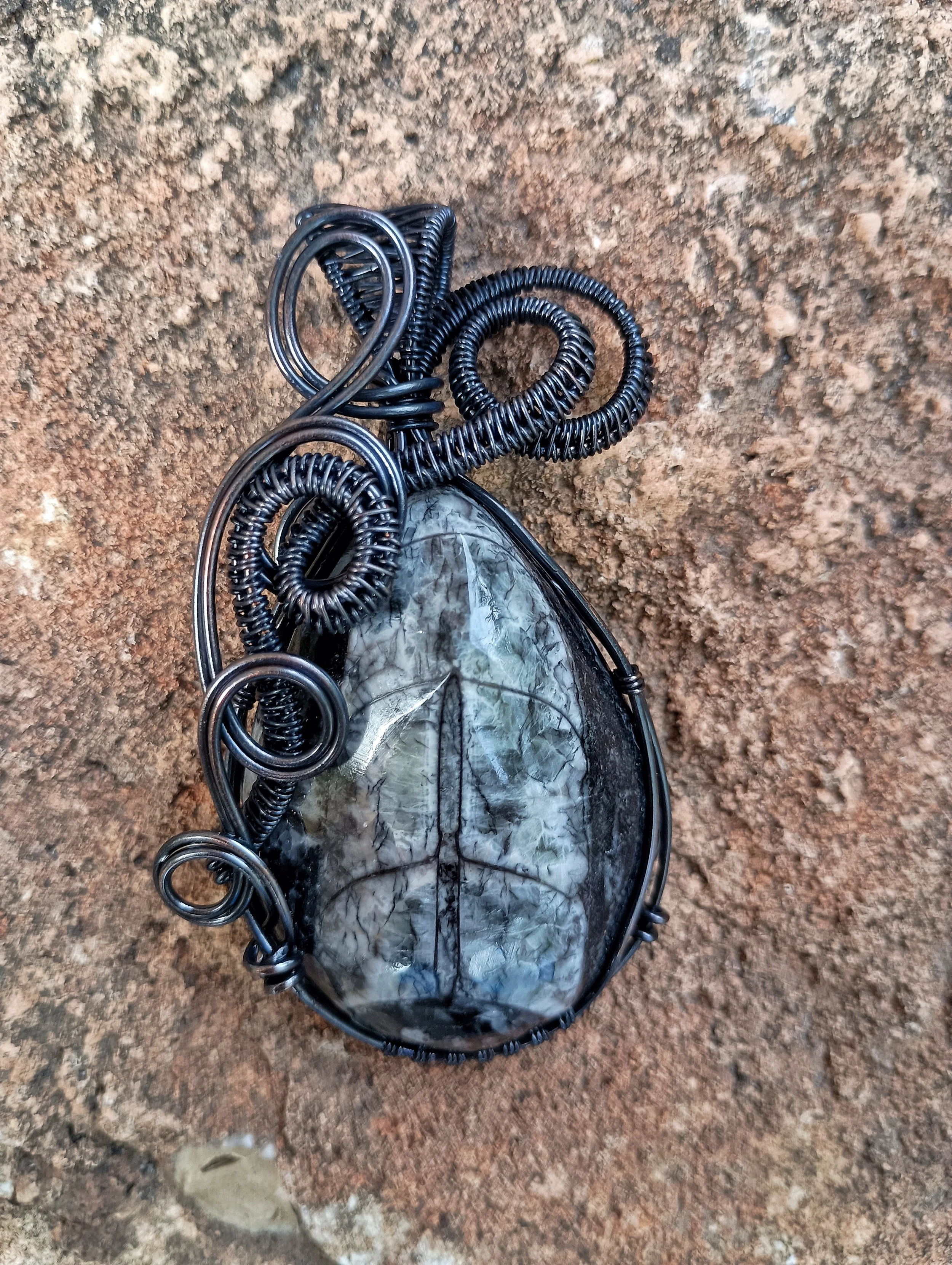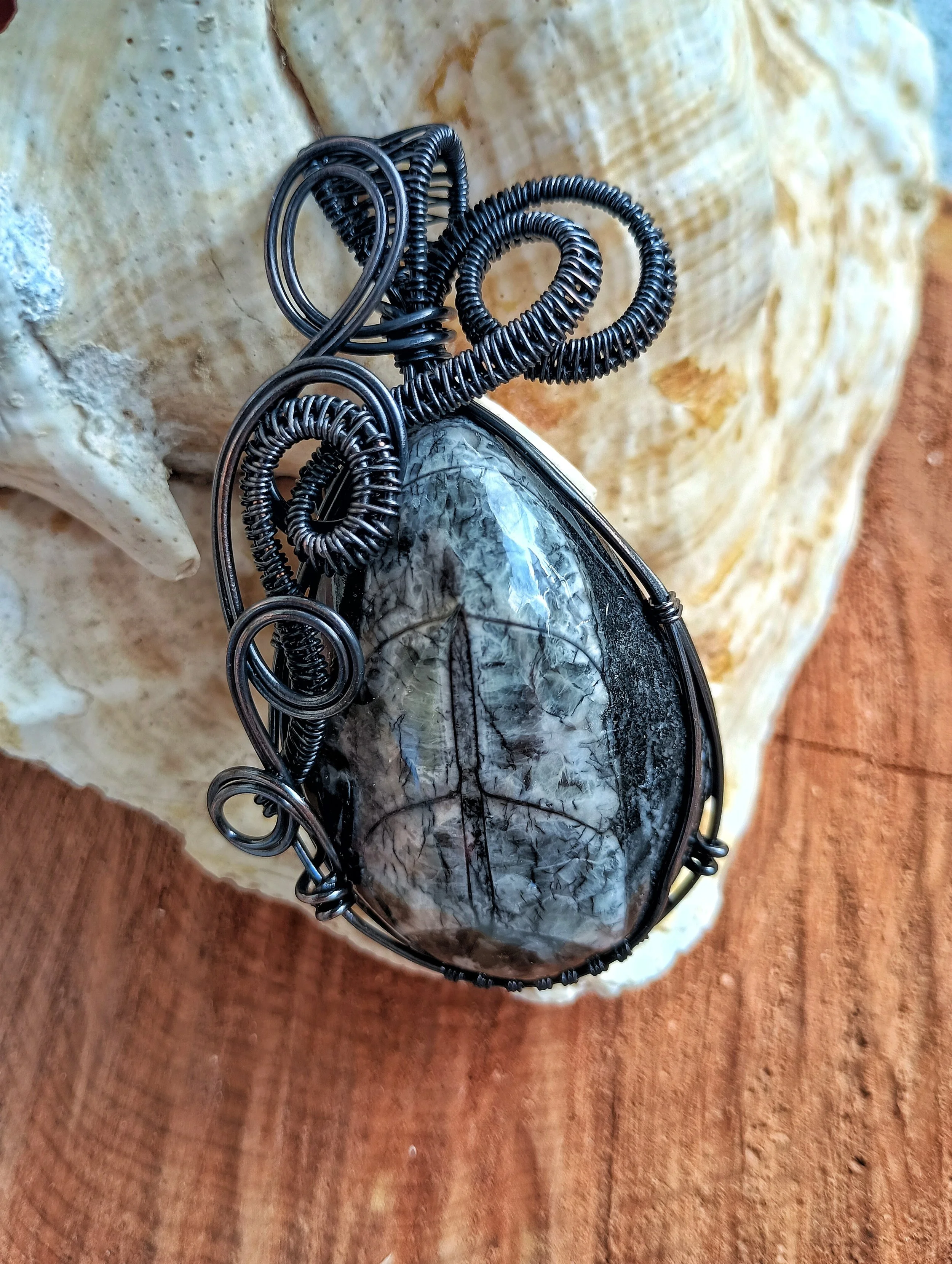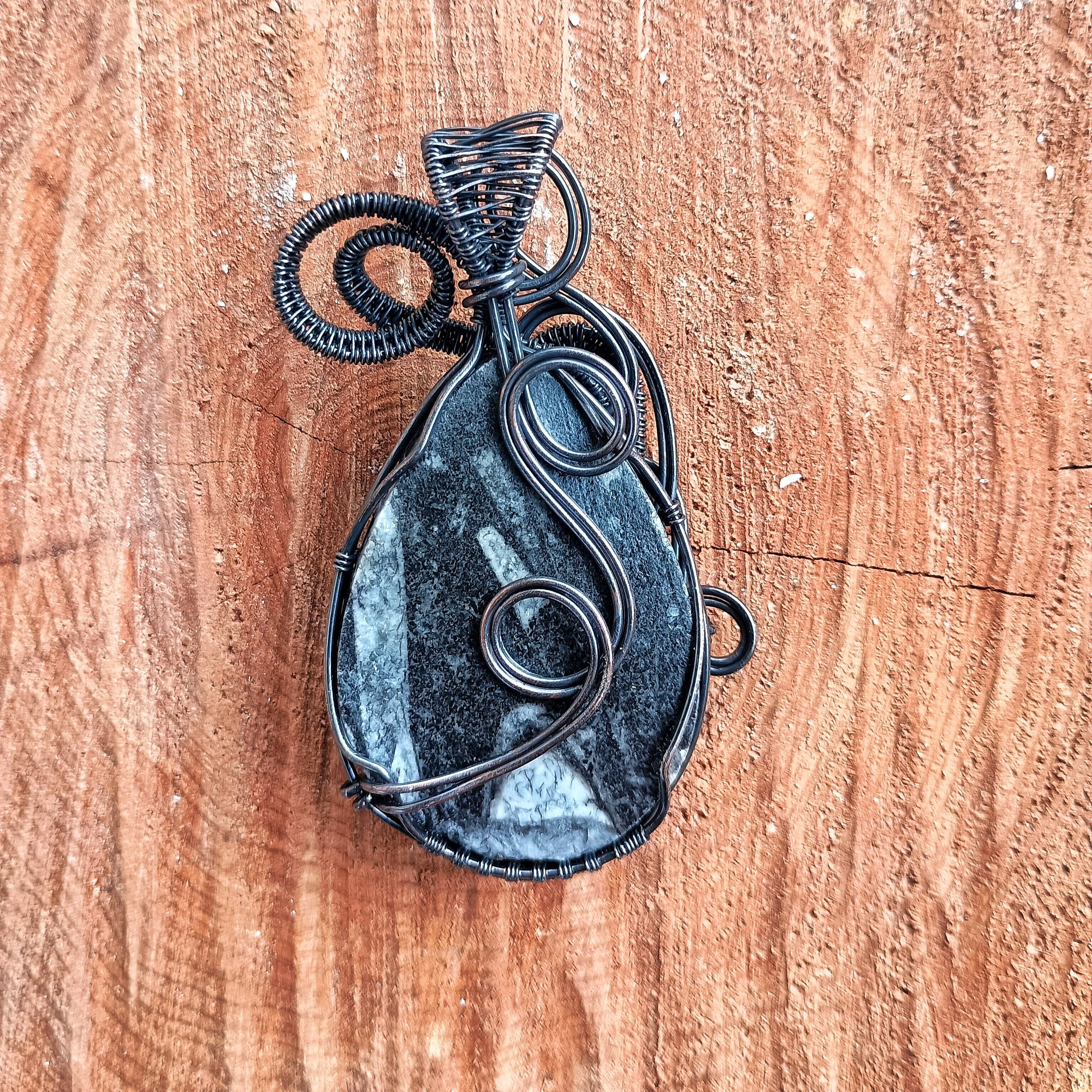 Orthoceras Fossil wrapped in handwoven copper wire. Copper has been patinaed for dark color and entire piece has been coated with a metal sealant. Comes on an adjustable leather cord. Each one of my pieces is a one of a kind creation.