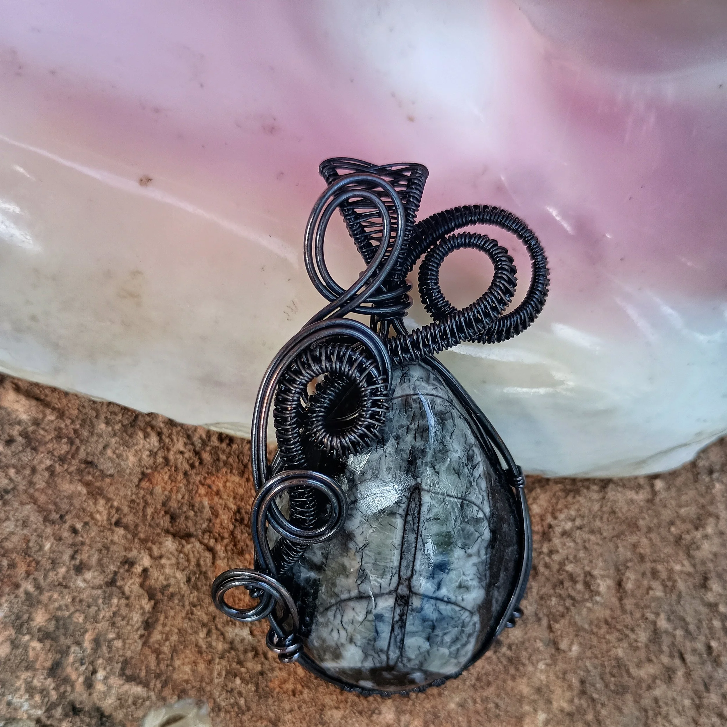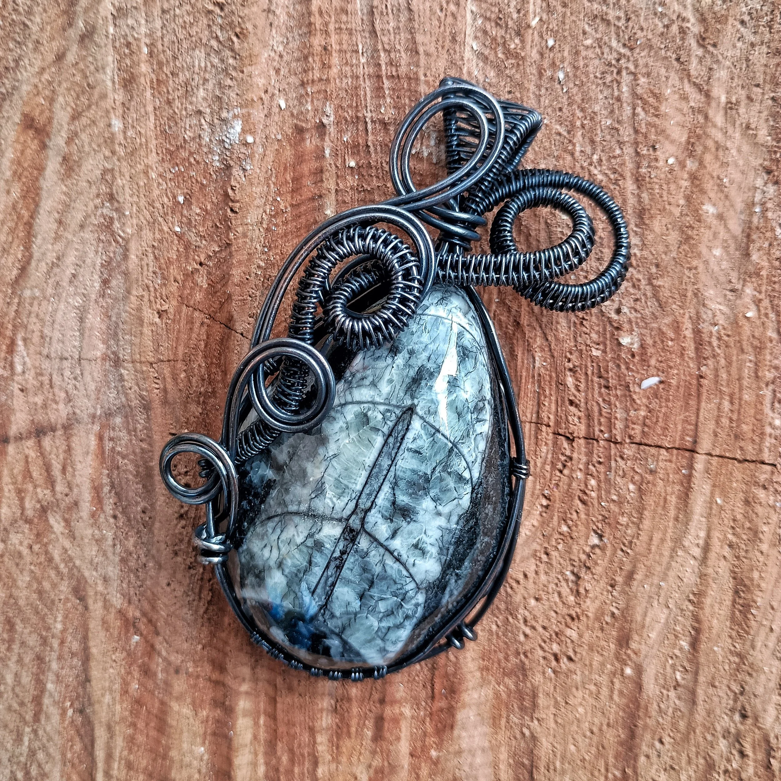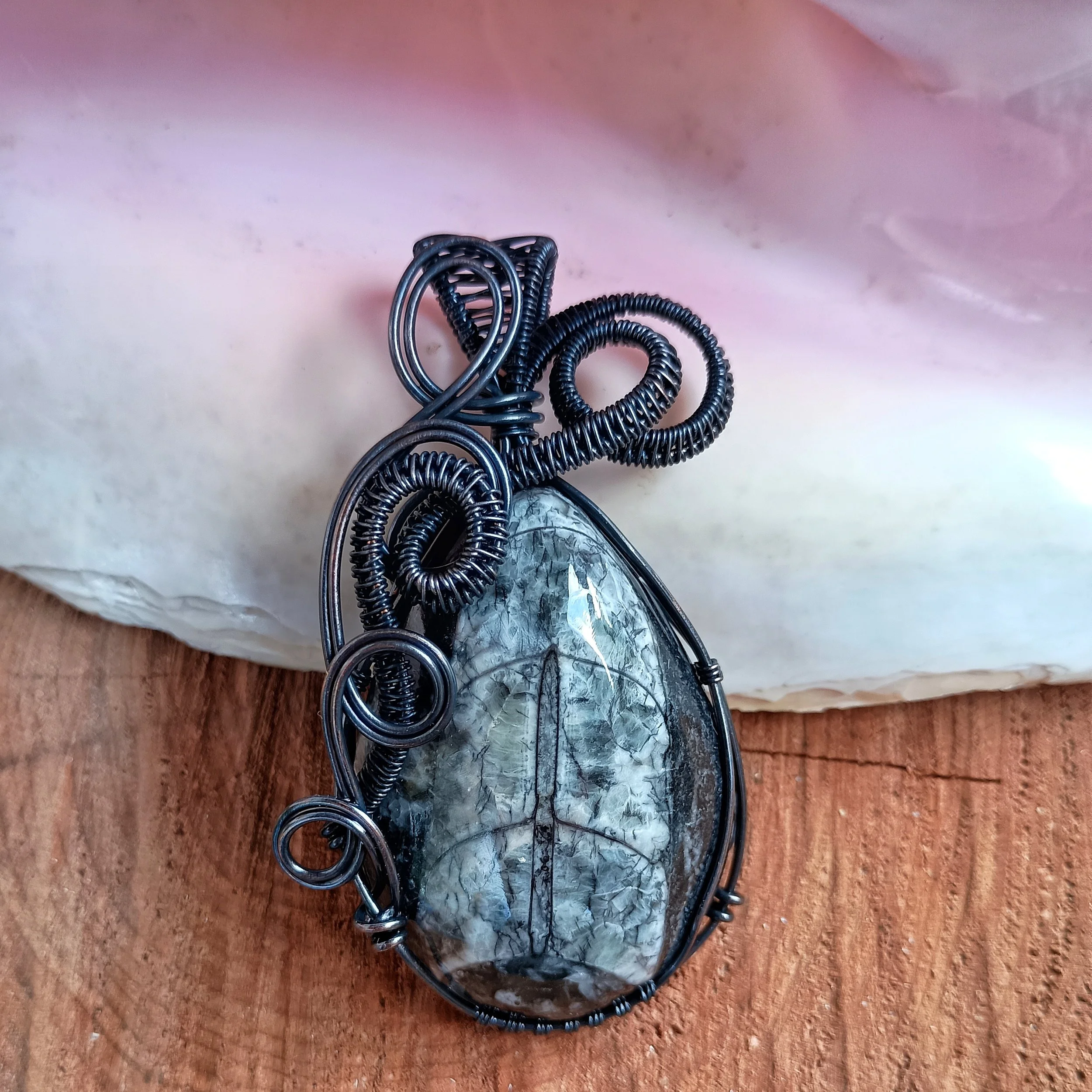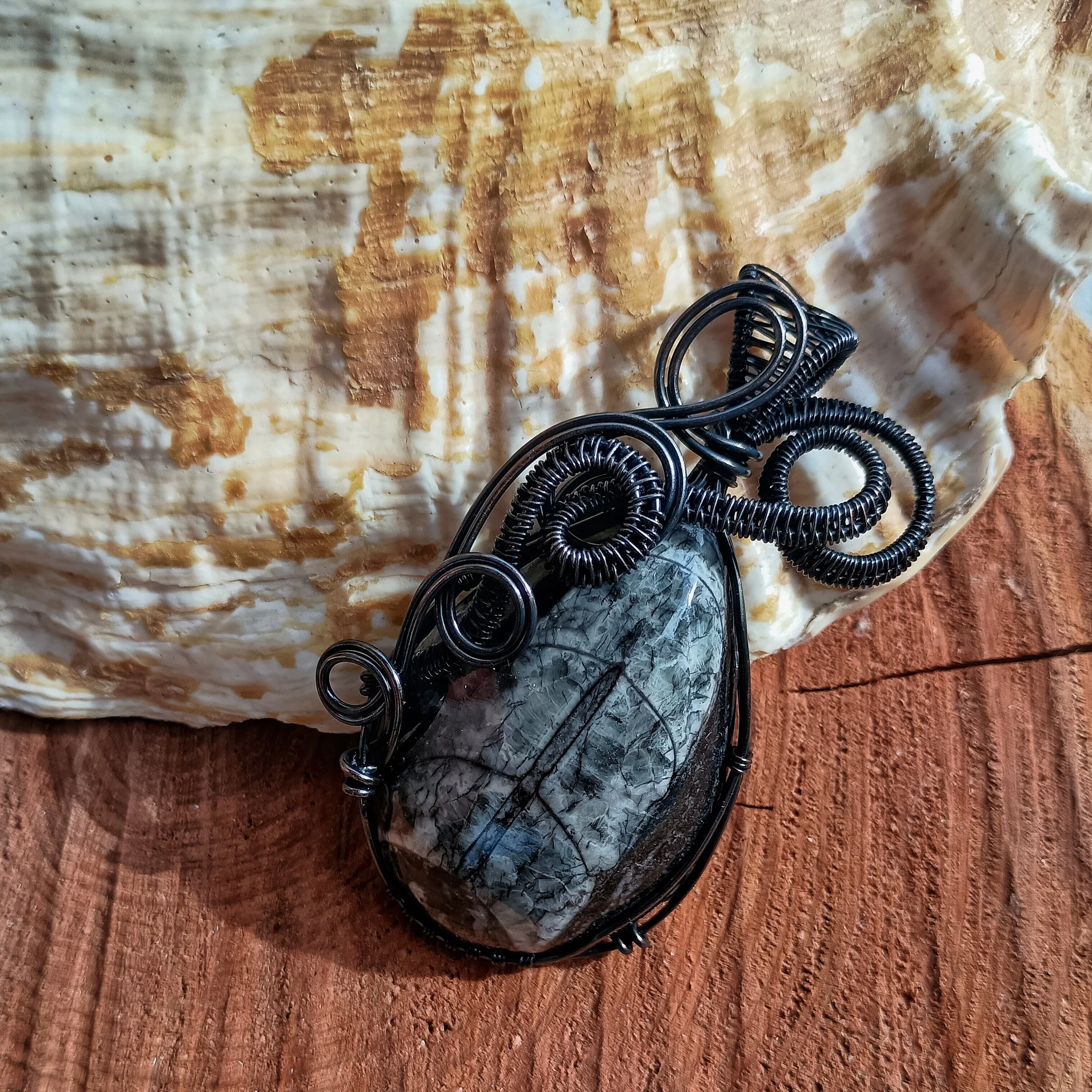 Orthoceras Fossil wrapped in handwoven copper wire. Copper has been patinaed for dark color and entire piece has been coated with a metal sealant. Comes on an adjustable leather cord. Each one of my pieces is a one of a kind creation.